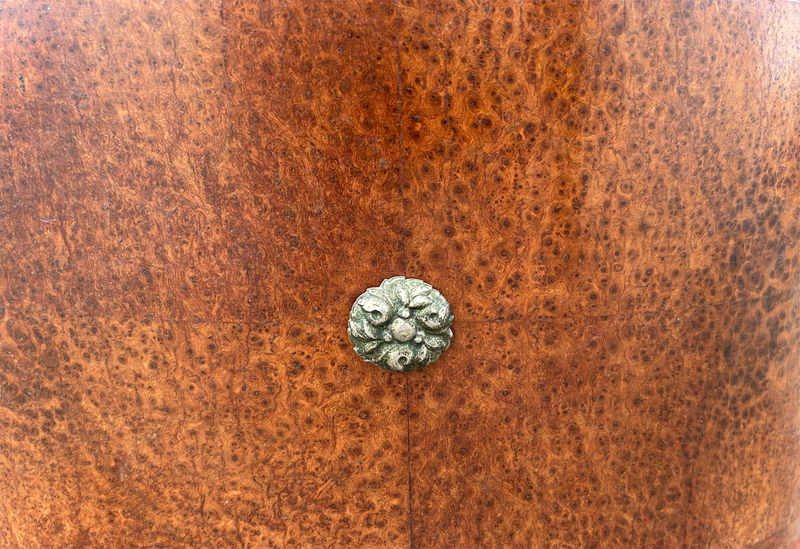 Le plaquage présente un motif loupe de noyer, d'une tonalité chaleureuse.