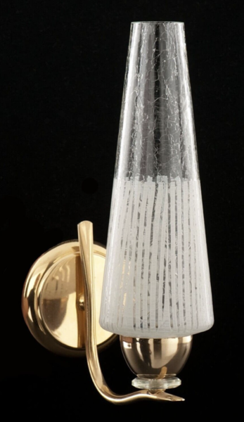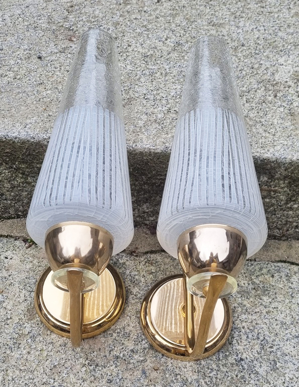 Chaque applique présente un bras courbé en laiton poli, se déployant avec souplesse depuis une base circulaire pour soutenir un diffuseur en verre conique finement travaillé. Le verre dépoli est gravé de motifs linéaires verticaux dans sa partie inférieure, tandis que la partie supérieure, légèrement bullée, laisse filtrer une lumière douce et vibrante. Ce contraste entre matière brillante et texture satinée confère à l’ensemble une présence à la fois discrète et sophistiquée.