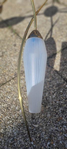 Ces luminaires se distinguent par leur structure en laiton doré courbé, formant un mouvement fluide et aérien, et leurs diffuseurs en verre opalin blanc strié, diffusant une lumière douce
