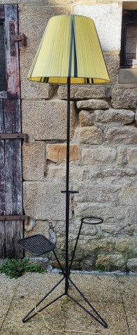 Lampadaire multifonctionnel, porte pot et porte revues, en fer forgé, des années 50.