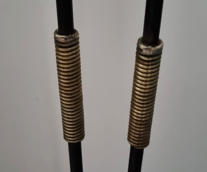 Pied tripode en acier. Scoubidou rouge à la jointure.