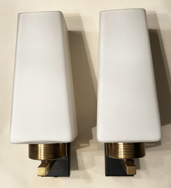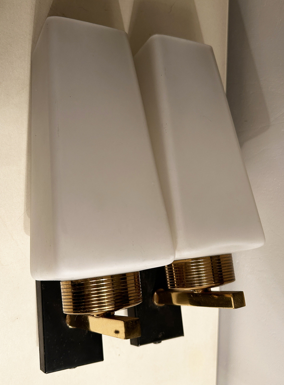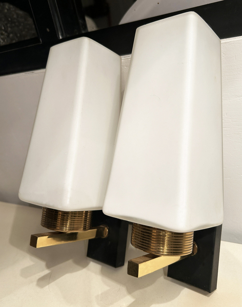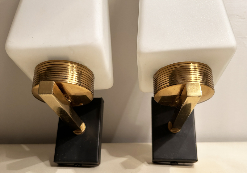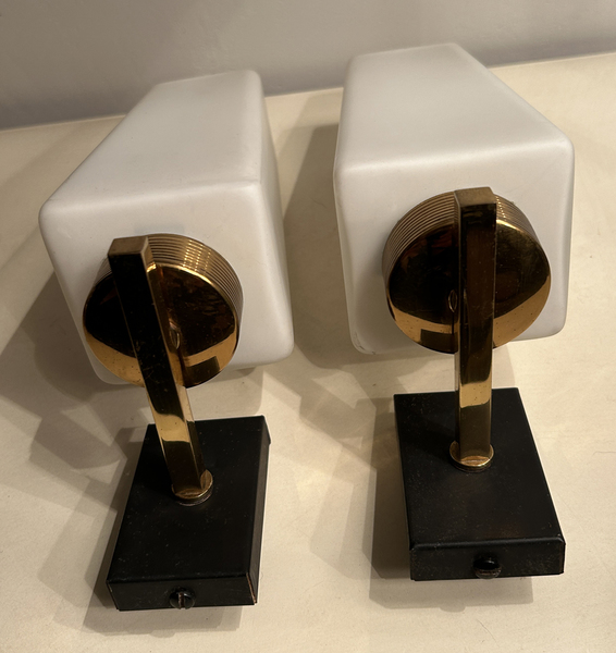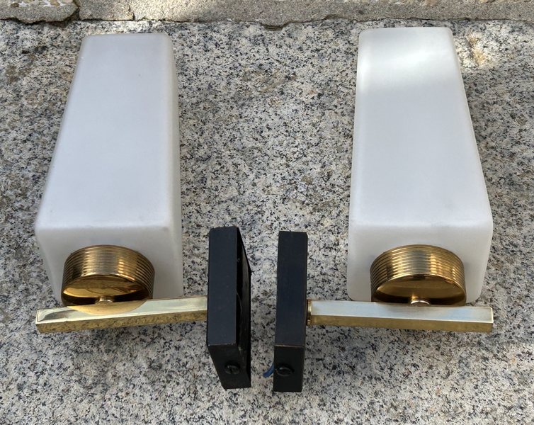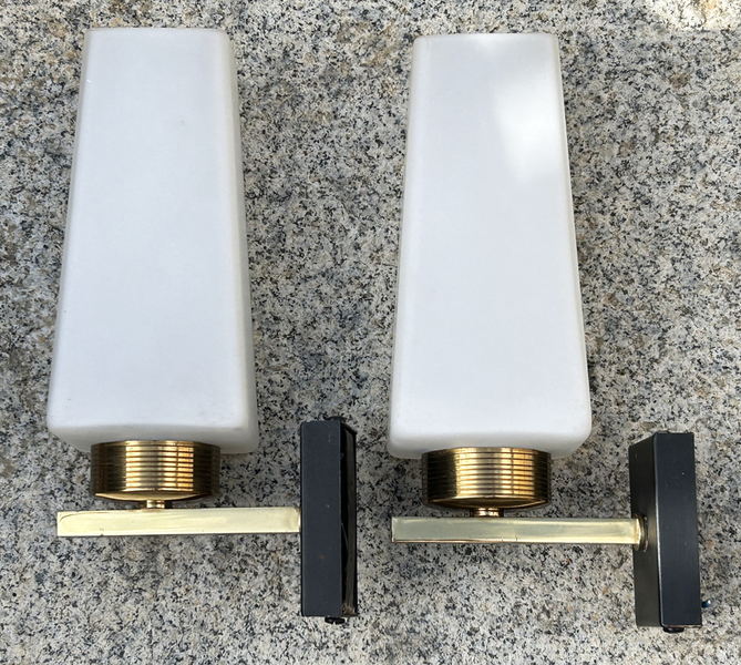 Jolie paire d'appliques des années 50 en laiton et opaline.