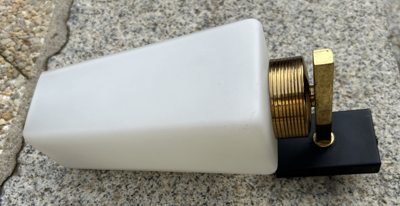 On reconnait le design spécifique des opalines, large de face et étroite en profondeur. Le verre des opalines est strié verticalement, ce qui donne un aspect design et dynamique intéressant. La structure en laiton et acier noir est solide.