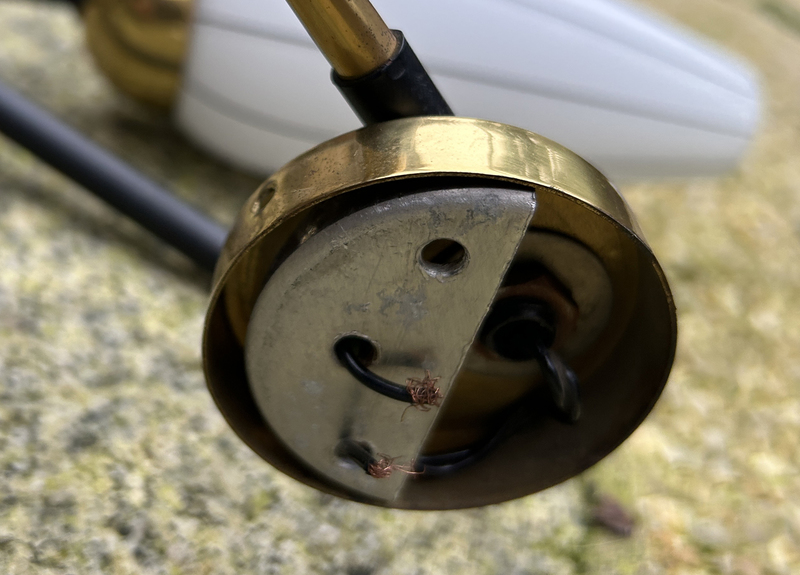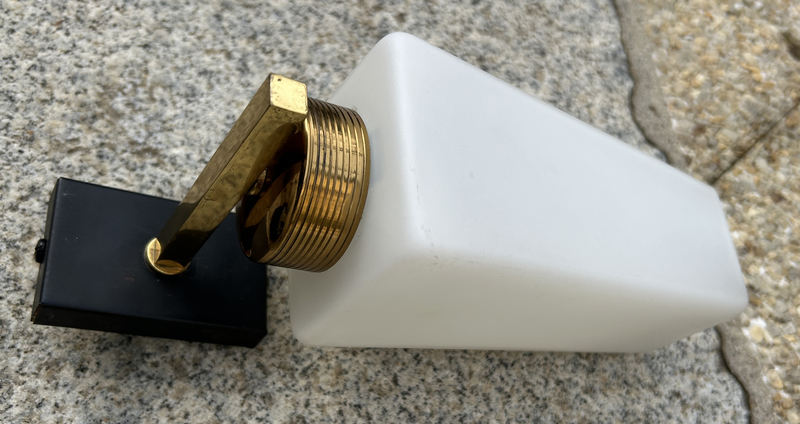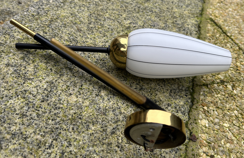 On reconnait le design spécifique de la structure en laiton et acier noir satin, large de face et étroite en profondeur. Le verre des opalines est blanc opaque et produisent une lumière douce,