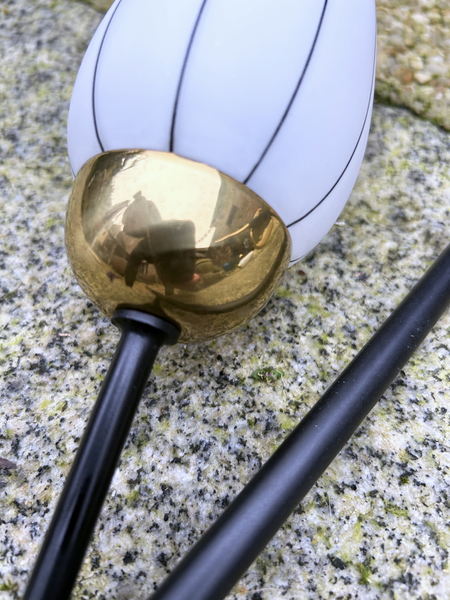 Leur structure est en laiton doré composée de deux tiges effilées reposant sur une grande rondelle. Elles sont coiffées d'une belle opaline biseautée blanche.