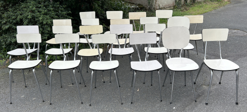 Lot de 20 chaises en formica des années 70. Elles ont des formes et tailles différentes et sont toutes dans des tonalités crème.