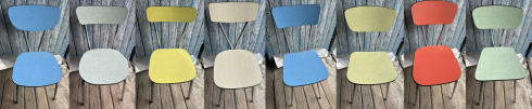Pour ajouter une belle note vintage à votre décoration et de la gaieté, voici un ensemble de 8 chaises en formica de toutes les couleurs : deux bleues de forme différente, une verte pâle, une verte vif, une jaune vif, une jaune pâle, une crème et une corail.