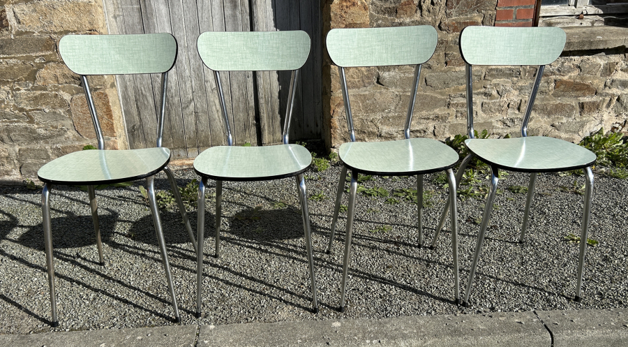 Elles sont toutes en bon état, tant du point de vue du formica que de leurs pieds chromés. Leur tonalité est rare puisqu'elles sont vert amande. Leur ligne reste tout à fait moderne et contemporaine.