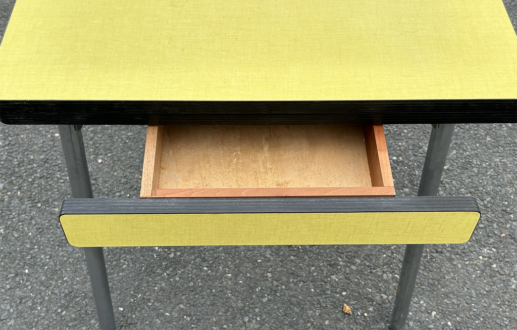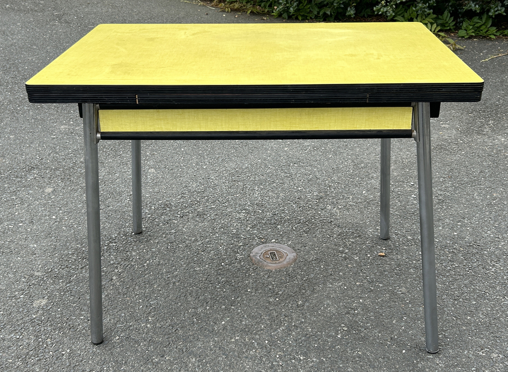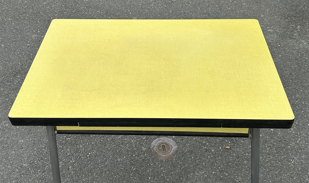 table plateau formica couleur tilleul, gainé d'aluminium. Quelques petits éclats sur le plateau mais rien d'important ou qui gâcherait l'aspect du meuble (photos sur demande).