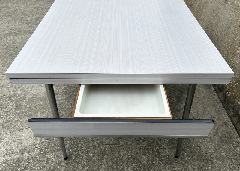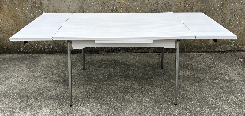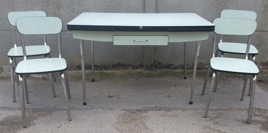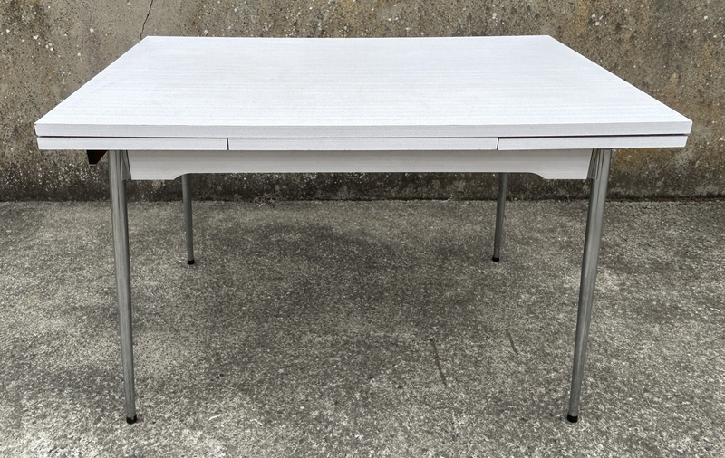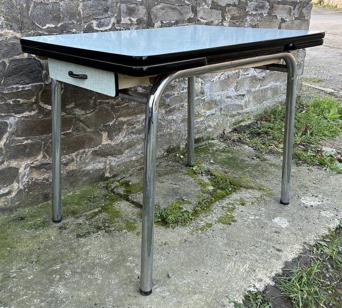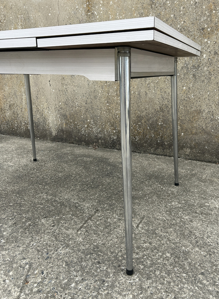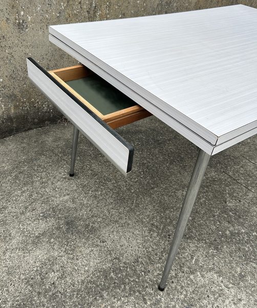 Superbe ensemble en formica et aluminium des années 50, en bon état. Quelques traces d'usure sur une des allonges, sans importance, ça fait partie de son charme. Elle a un grand tiroir. Les 3 chaises sont superbes également.