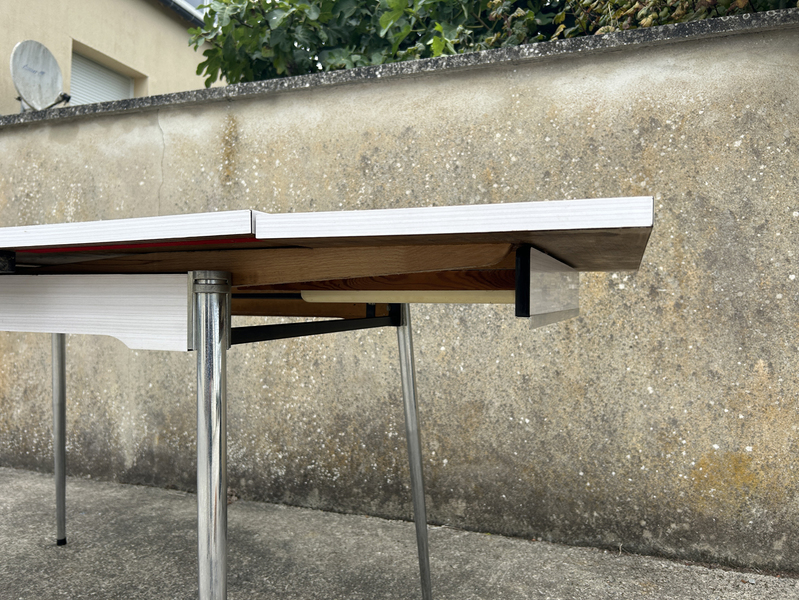 Table en formica couleur framboise. Plateau principal légèrement décoloré par rapport aux allonges, qui n'ont pas dû être très utilisée. Elle est montée sur 4 pieds chromés.