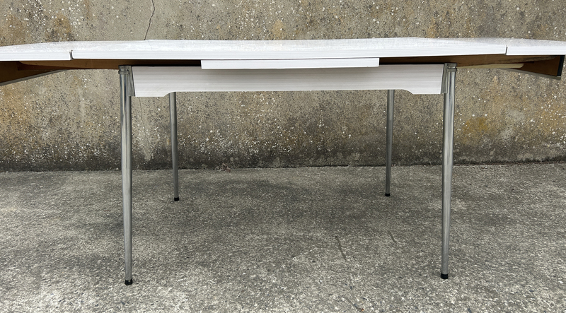 A noter : quelques petites traces d'usage sur le plateau (voir les photos), rien d'étonnant pour une table qui a fêter ses 50 ans. Une légère décoloration sur les allonges due probablement au frottement à l'ouverture, rien de choquant, cette patine du temps ajoute encore à son charme.