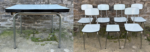 Le tout est en très bon état, à noter un de tout petits éclats sur un bord de la table, rien de remarquable ou gênant. Cela ne gâche rien à la beauté de ce bel ensemble en formica des années 60.