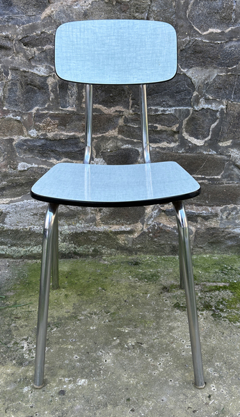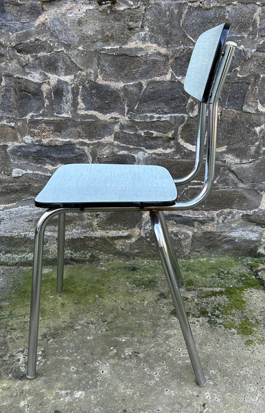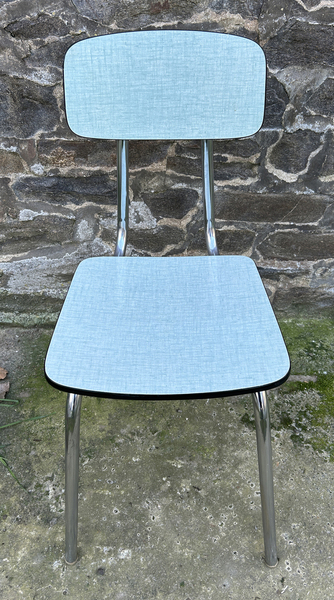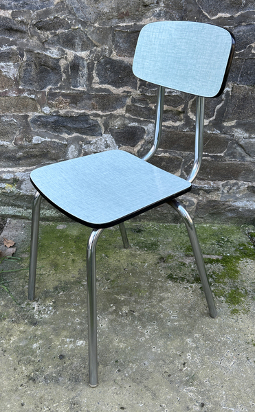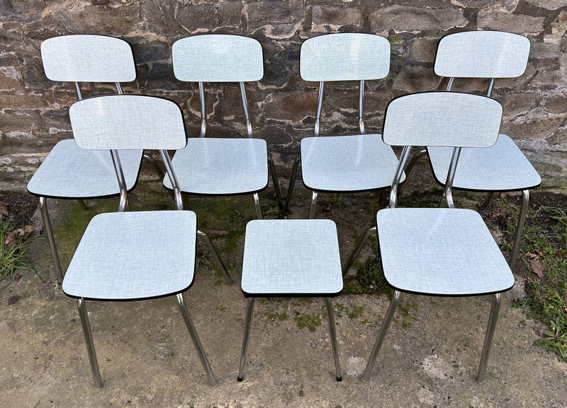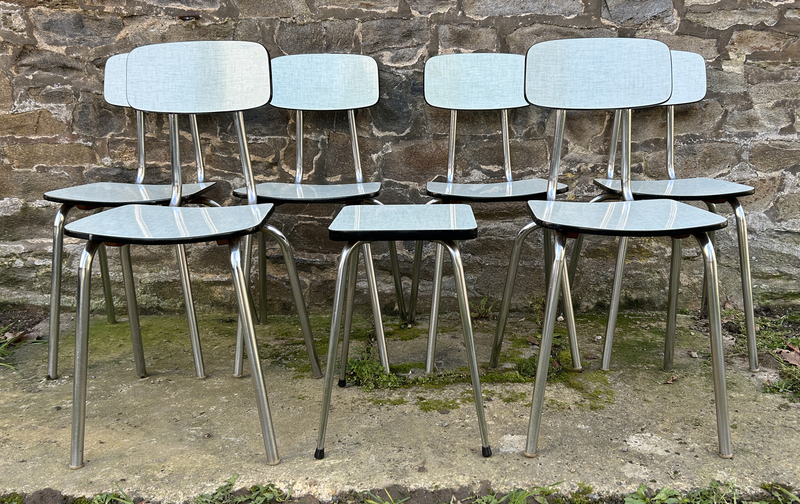 Six chaises robustes en formica vert pâle assorties, en très bon état également, chrome étincelllant. Assise confortable et ergonomique.