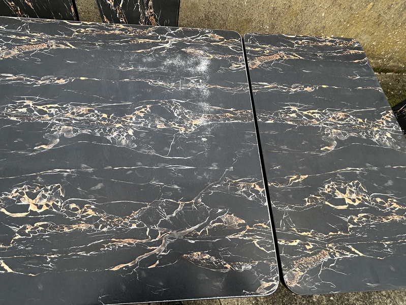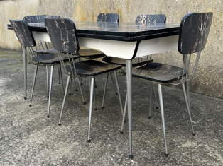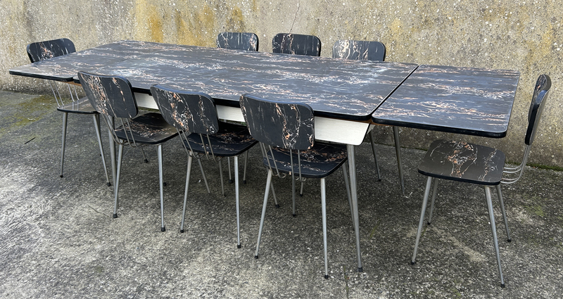 Table formica gris anthracite marbré veiné rose et crème avec ses 8 chaises, vintage,