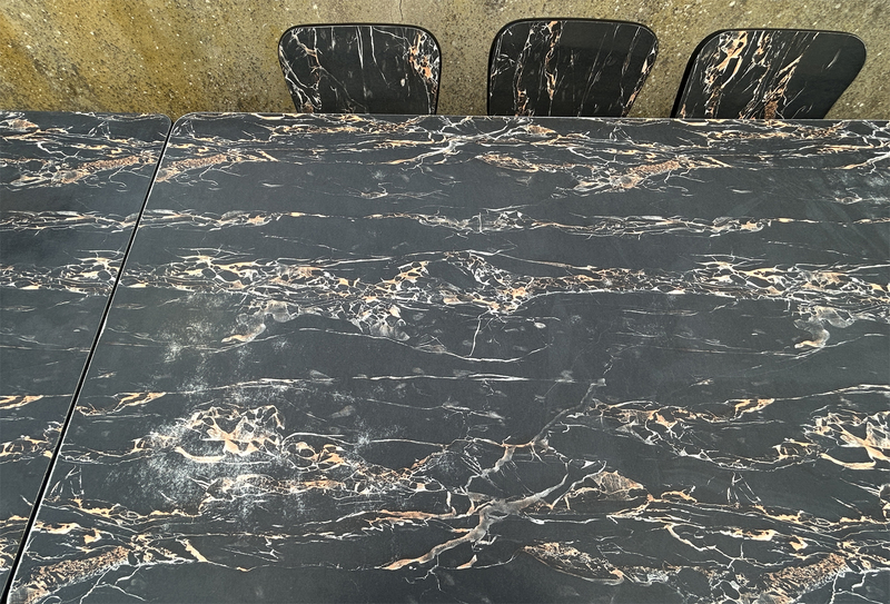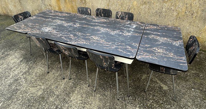 Bel ensemble en bon état composé d'une table à allonges et de 8 chaises en formica gris foncé marbré. Quelques traces d'usage sur le plateau sans conséquence car elles se mêlent au veinage du plateau.