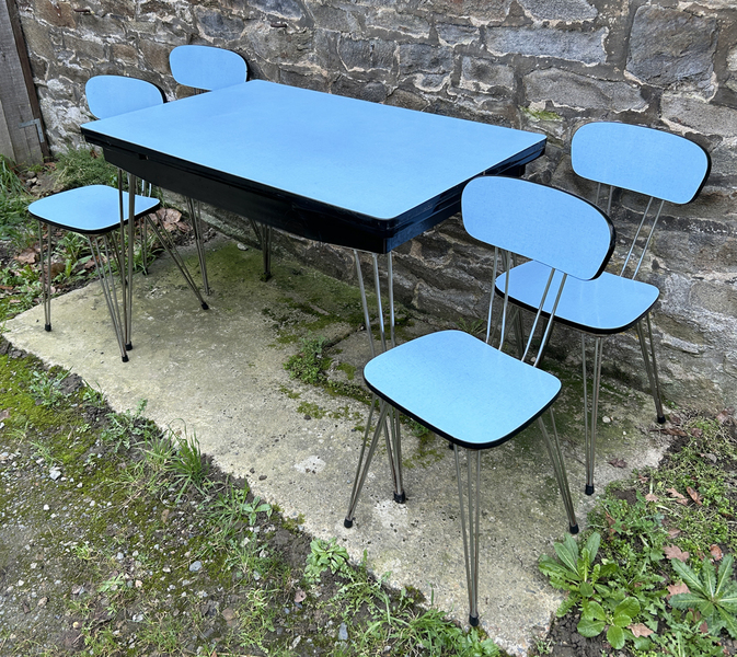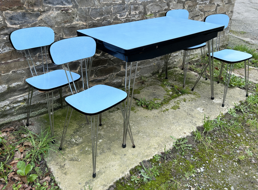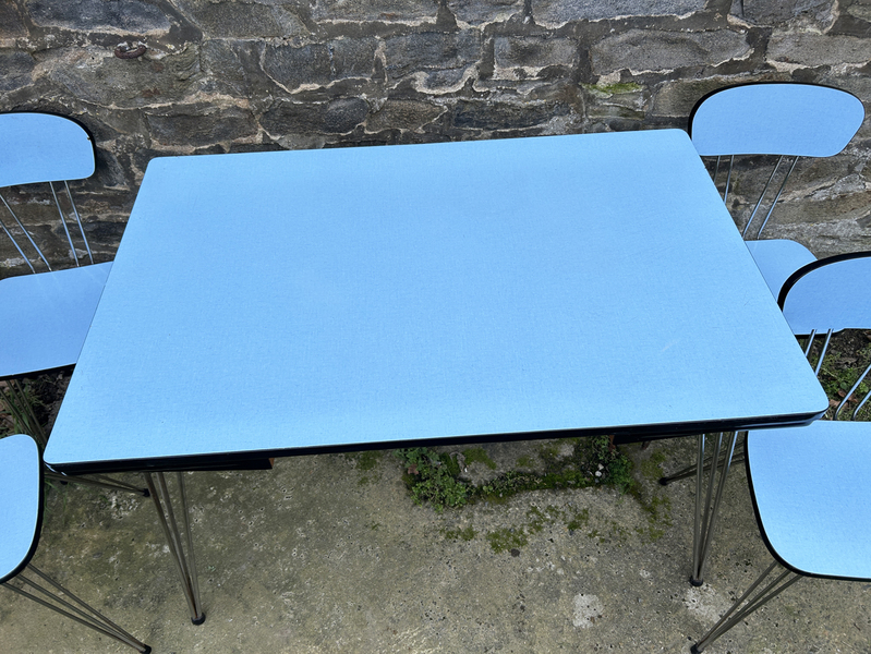 Table formica bleue pieds eiffel, 1950, chaises plastilux, 1950