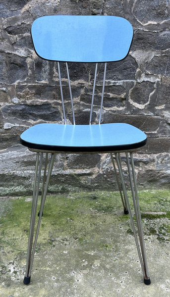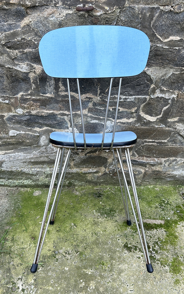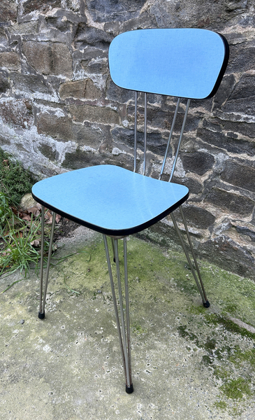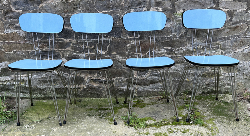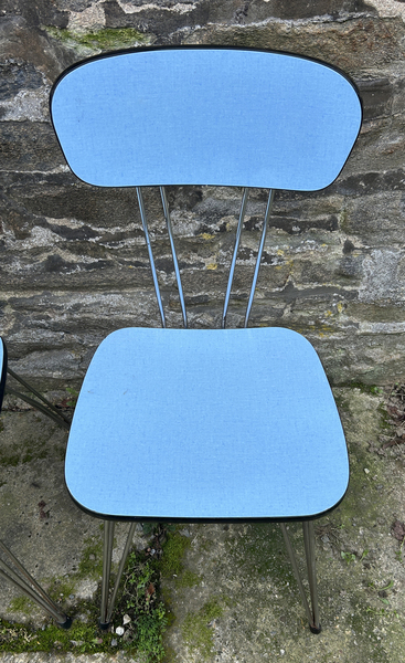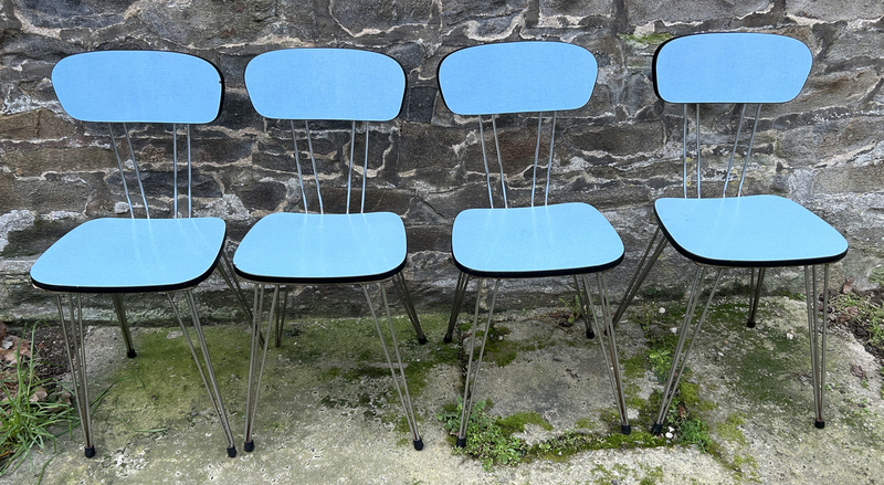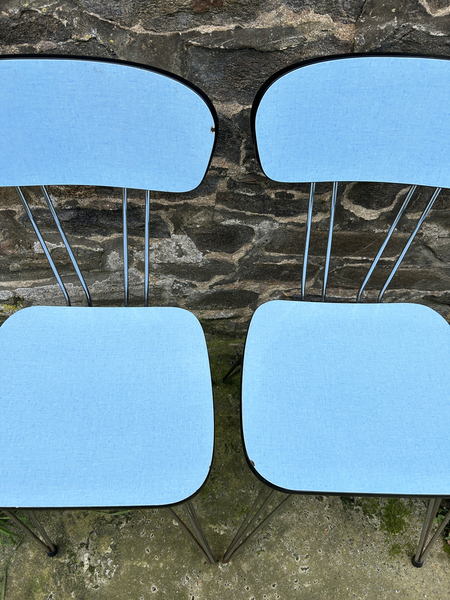 4 superbes chaises formica bleu à motifs (blanc très pâle), modèle peu courant.