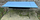 Plateau et allonges en formica bleu à petits motifs discrets. Le coffre est en bois recouvert de formica blanc