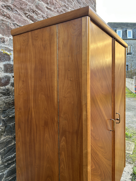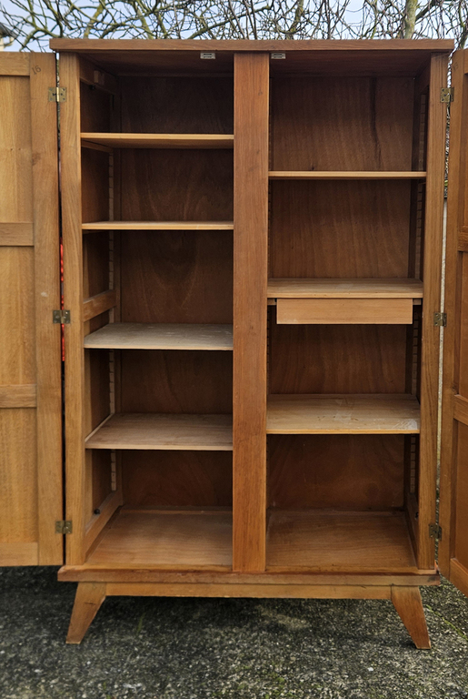 Belles proportions pour cette armoire penderie vintage en bois clair massif et plaquage des années 50.