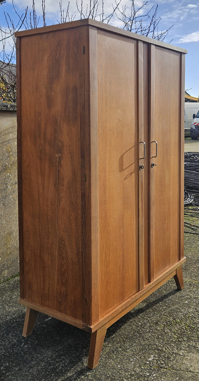 Belles proportions pour cette armoire penderie vintage en bois finition chêne moyen, bois massif et plaquage des années 50. Pieds équerre.