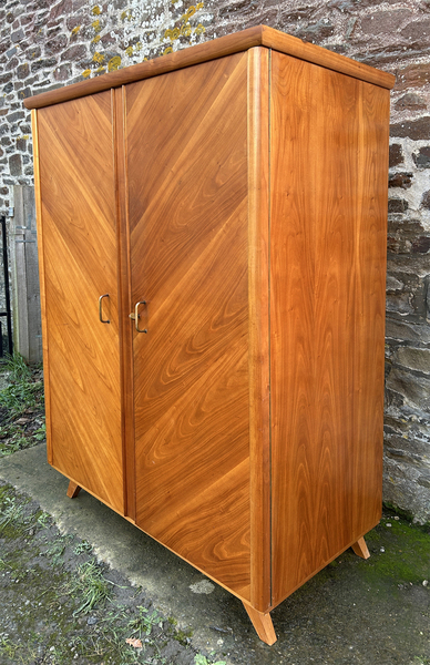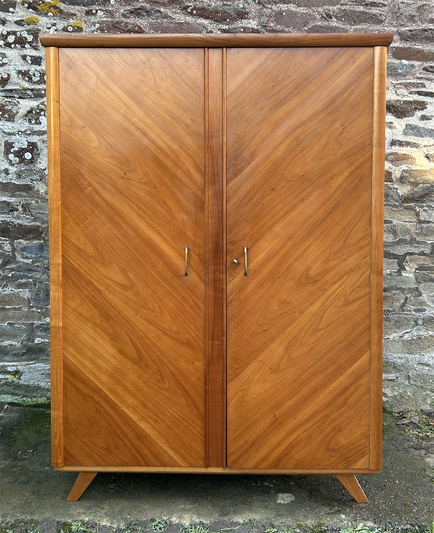 Armoire mid-century années 60 en bois, façade en chevrons et pieds compas