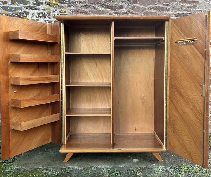 Sur toute la largeur de cette armoire en noyer massif, on trouve une série d'étagères, au centre un beau miroir biseauté et un tiroir au centre. Les portes sont stylisées et légèment bombées. Ses pieds travaillés sont aussi attrayants, leur forme compas leur apporte une touche design typique de cette époque. Elle est stable et solide.