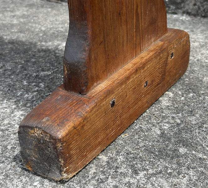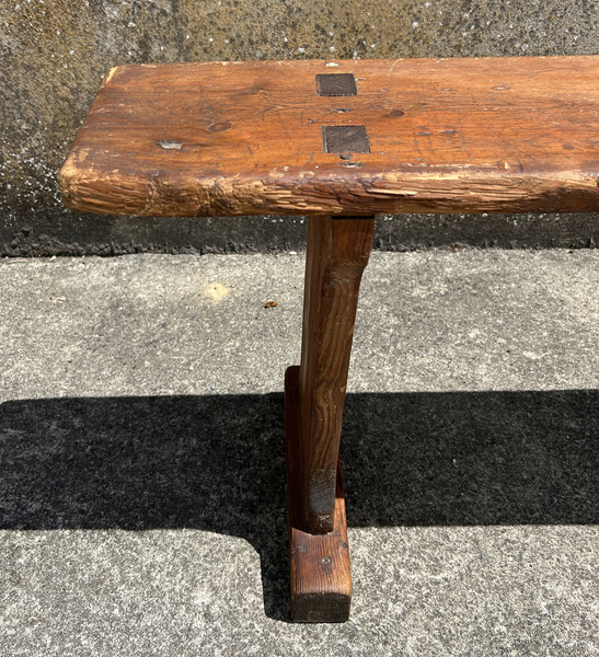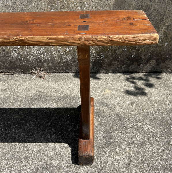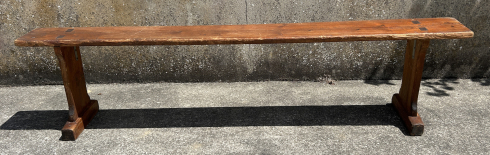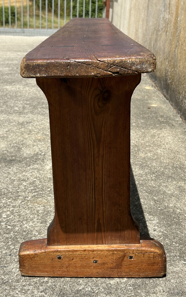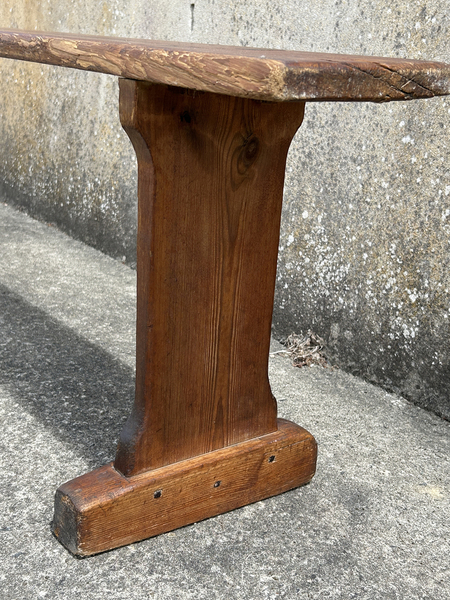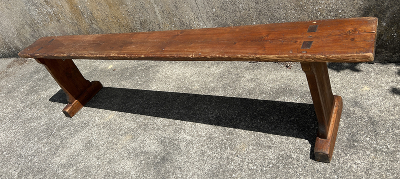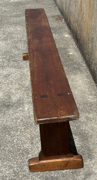 Grand banc ancien tout en bois de pin. Stable et solide. Il a été chevillé bois. Il présente des traces d'usage qui lui confèrent une patine tout à fait charmante. Le banc a été traité contre les insectes.