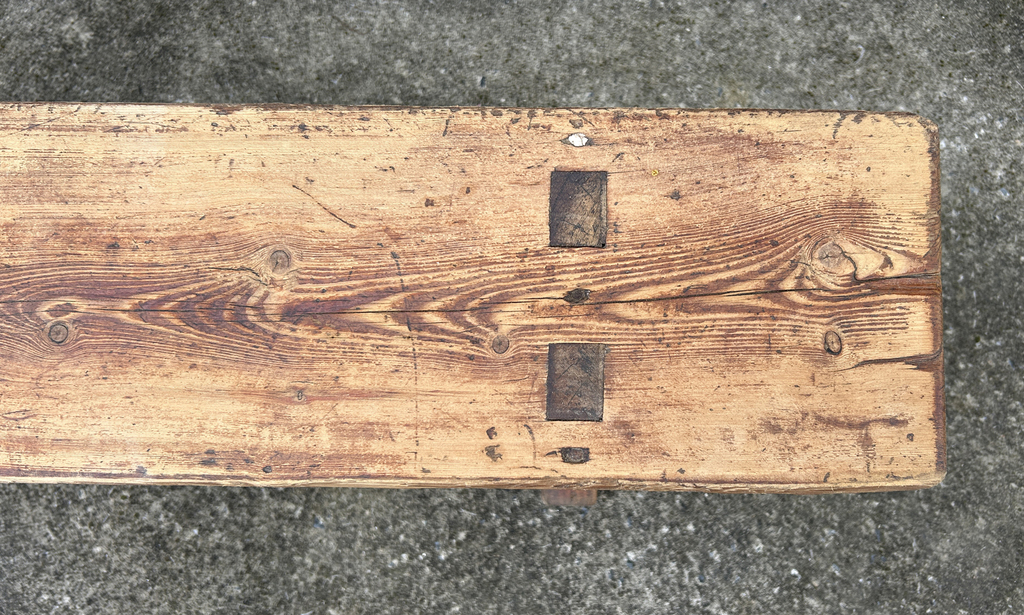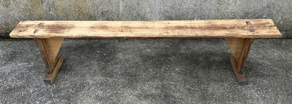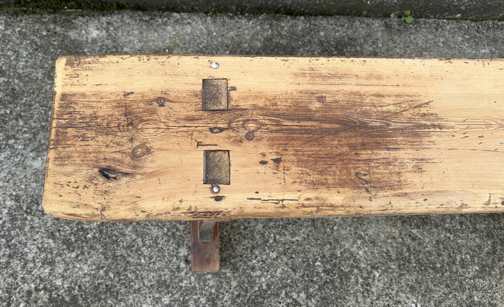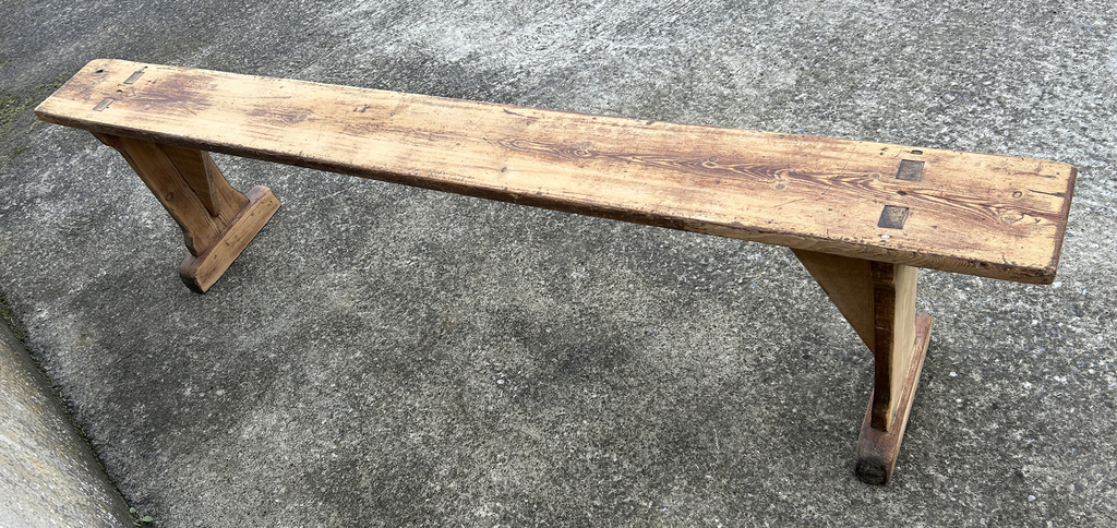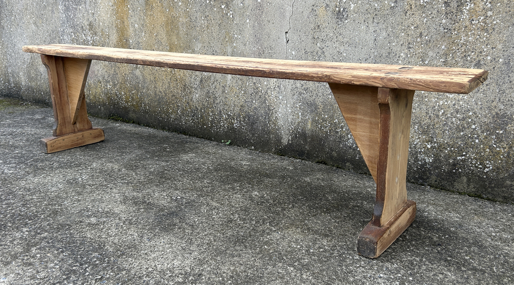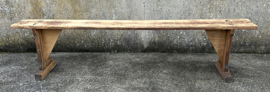Grand banc ancien tout en chêne rouge. Stable et solide. Il a été chevillé bois. Il présente des traces d'usage qui lui confèrent une patine tout à fait charmante. Le banc a été restauré et traité contre les insectes.