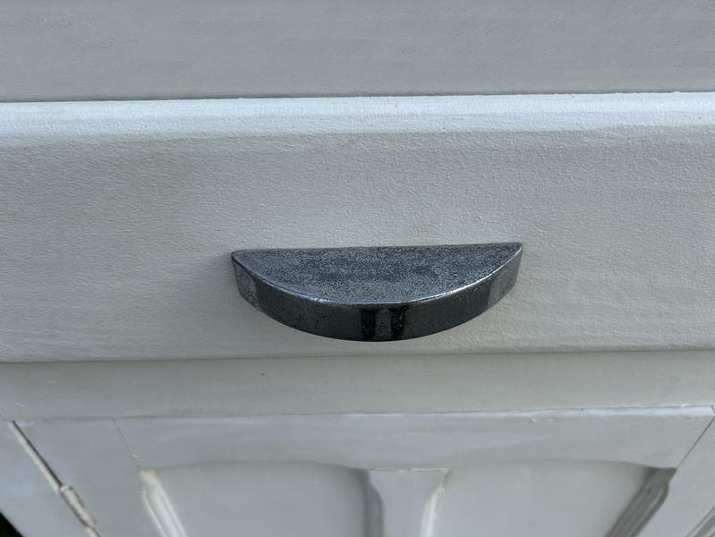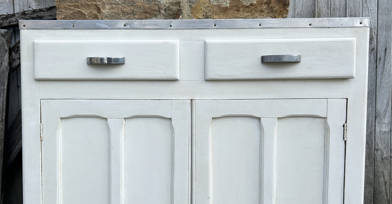 Nous avons conservé les poignées en métal d'origine. Décapée puis peinte avec une peinture effet fer martelé.