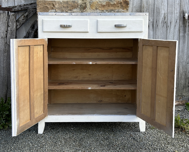 Il peut servir de séparation dans une pièce, entre la cuisine le salon ou la cuisine et la salle à manger, à l'intérieur d'une grande cuisine (c'est ainsi que nous l'avons trouvé dans une grande maison bourgeoise en bord de seine). Une fois restauré ce sera un meuble étonnant. Il est tout en bois, possède 4 jeux de portes ui donnent accès au contenu des placards.