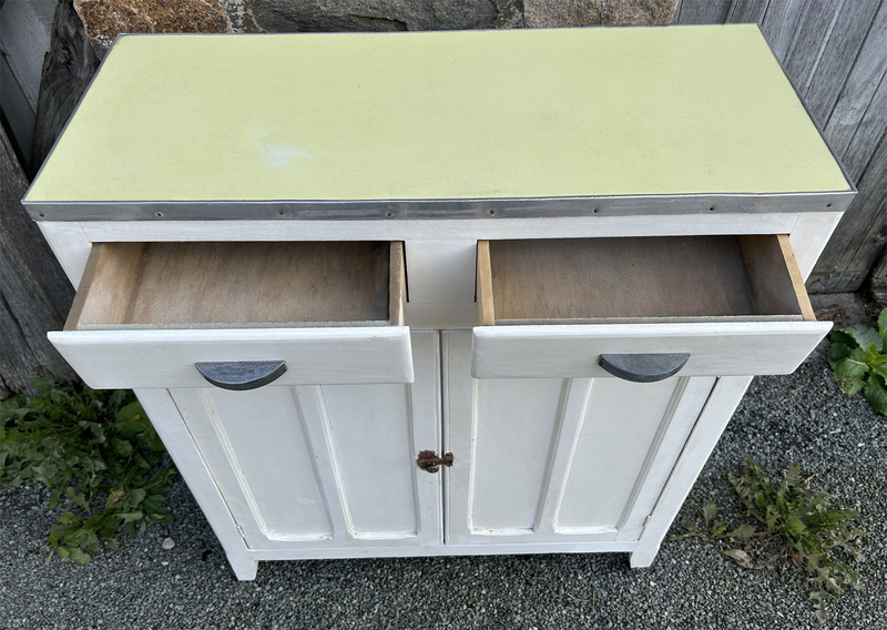 Buffet plein de charme. Il a été repeint par son ancien propriétaire en conservant tant que possible les traces du temps. Nous ne savons pas ce qu'il y a sous le vynil rouge et épais, probablement un plateau de bois.