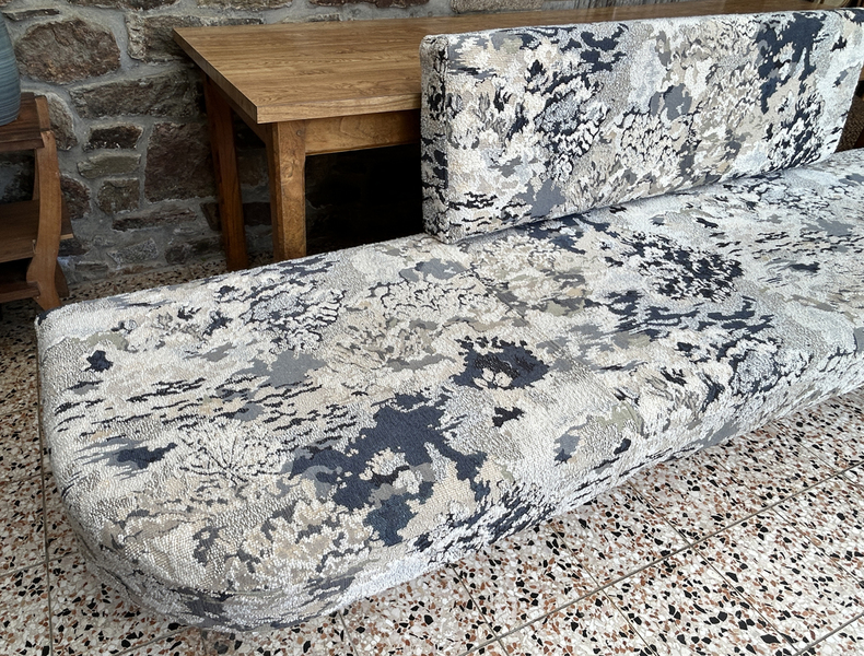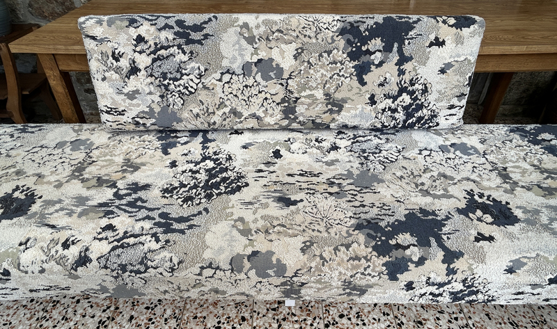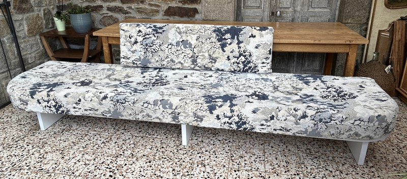 Réalisé sur mesure par un créateur pour un bel appartement parisien, voici une banquette d'un format exceptionnel puisqu'elle mesure 3 mètres de long. Un grand coussin dossier amovible se fixe au mur. La banquette a été montée sur un socle de bois mélaminé robuste et solide et de très belle apparence. Les finitions sont superbes. L'assise est déhoussable et lessivable.