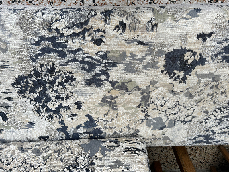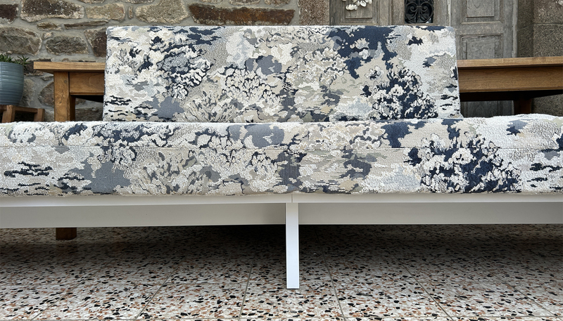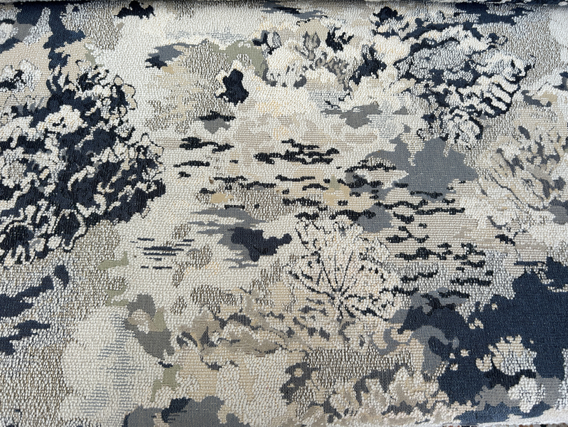 Le tissu luxueux est de très haute qualité et son motif à la fois exotique et moderne puisqu'il s'agit d'un tissu Eden Indigo, un jacquard matière à la fois innovant et fabuleusement expressif. Son paysage onirique peut aussi bien illustrer un jardin (évoqué par son nom Eden) qu'un monde sous marin (nous tenons la fiche technique du produit à votre disposition). Sa composition est 50% coton, 22% acrylique, 17% laine, 5% polyamide, 5% polyester, 1% viscose.