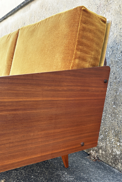 Les pieds compas et en teck de ce lit de jour (ou daybed), terminés par de chaussons de laiton, ainsi que la forme générale du meuble présente un design représentatif de ce qu'était le must dans les années 50. Ce canapé intemporel présente encore un aspect très contemporain et moderne.