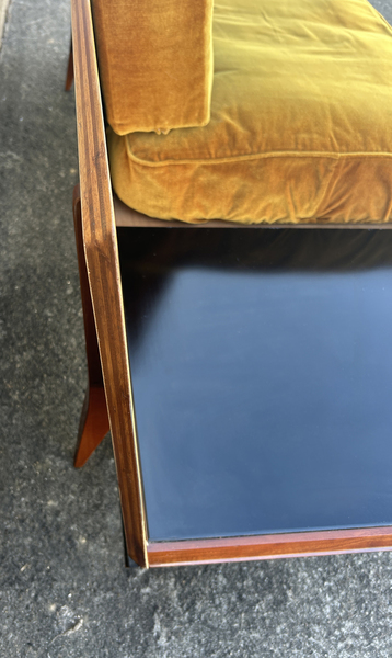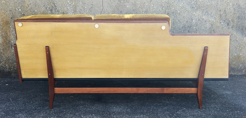 Il est composé de deux places et d'une structure solide et confortable en teck et bois ainsi que de laiton. Un grand coussin confortable entièrement recouvert de velours ocre jaune accompagne deux dossiers de même matériau et aspect.