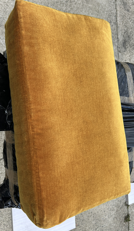 Sa structure et en bois paddé avec de la mousse de polyuréthane recouverte de velours fin couplé à de la résine 200gr/m² Ses pieds, d'une hauteur de 17 cm sont en métal façonné corten mat Les coussins d'assise sont paddés avec de la mousse de polyuréthane recouverte de fibre de polyester 350gr/sqm. Les coussins de dossier sont en fibre de polyester mélangée à de la plume d'oie lavée et stérilisée, divisée en sections et recouverte d'un tissu 100% coton blanc anti-plume. Les cylindres des coussins du haut dossier sont remplis de mousse de polyuréthane 30P et recouverts de velours fin couplé à de la résine 100gr/m².