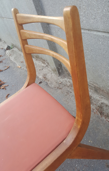 Superbe chaise scandinave des années 60, structure en hêtre massif. Assise en skaï rouge.
