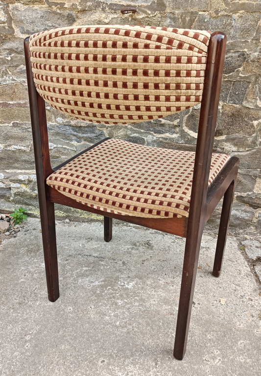 Jolies chaises typiques des années 60, aux lignes sobres et élégantes. Ces chaises dannoises sont solides, stables et confortables. Elles sont recouvertes d’un tweed en bon état damier beige et brun.