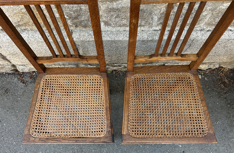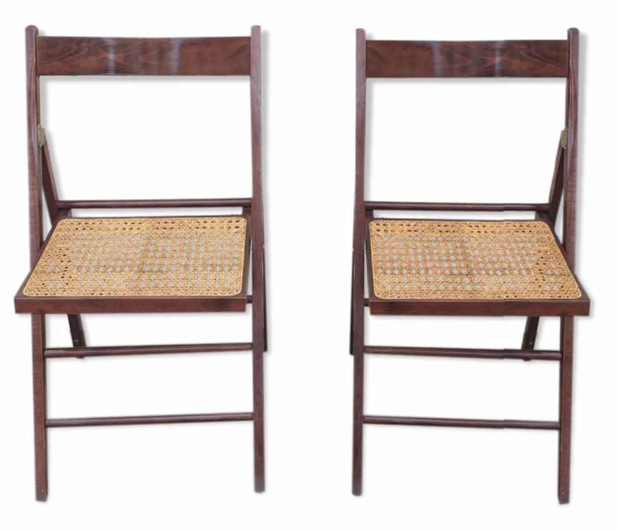 Chaises cannées. De couleur bois acajou, elles sont pliantes.