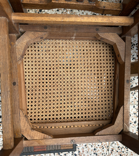 la paille a des brins de différentes couleurs, naturel, vieux rose et vert. Le bois est aujourd'hui teinté acajou.