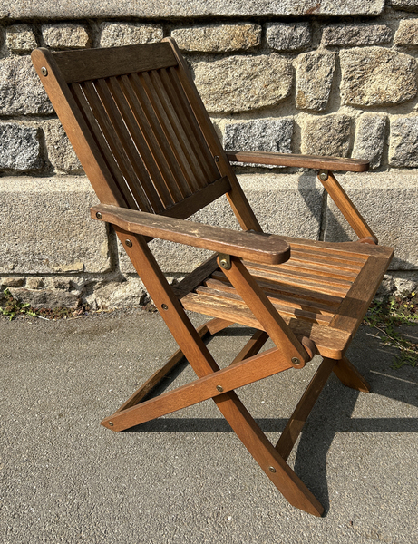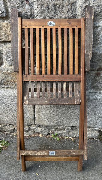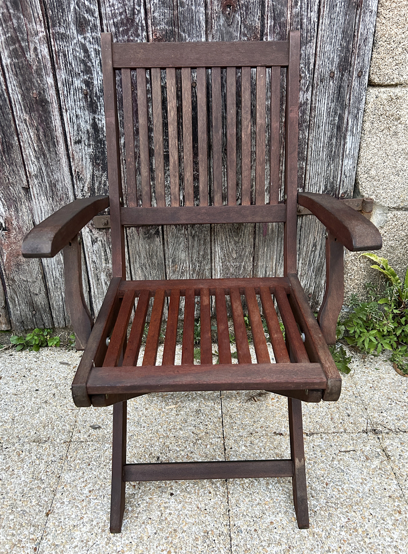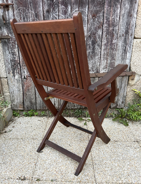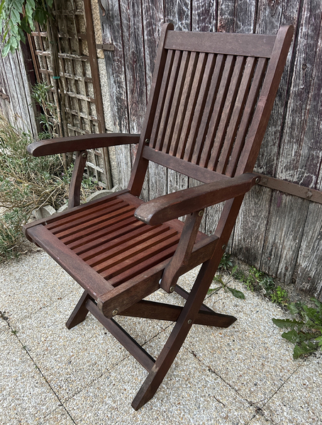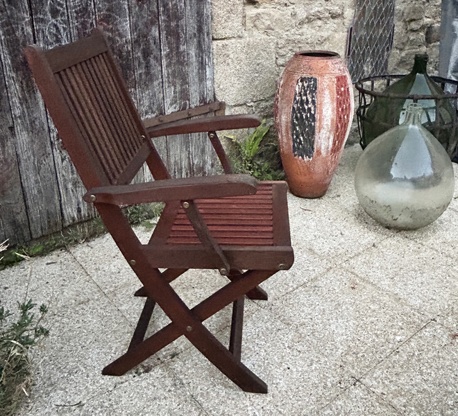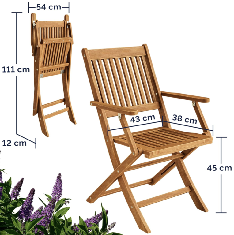Elle est pliante et facile à ranger jusqu'au prochain printemps. Elles ont un haut dossier, une assise large et confortable et des accoudoirs.