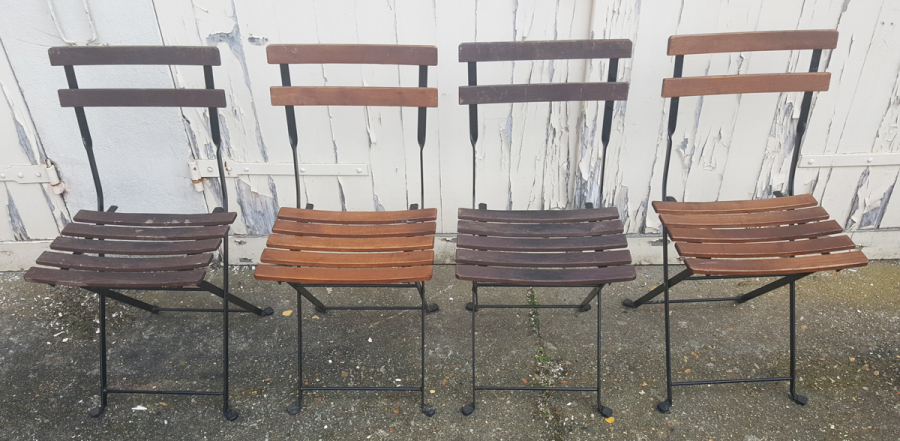 Créée à la fin du XIXème siècle, le mobilier de jardin pliant à immédiatement connu un grand succès notamment auprès des bars et limonadiers. Ils s'épargnaient ainsi le coût d'une terrasse fixe :-).