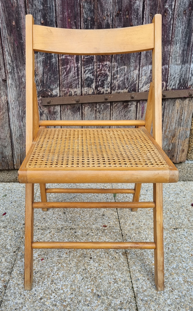 Chaises cannées au niveau du dossier et de l'assise. De couleur bois acajou, elles sont pliantes et facilement transportable grâce à une petite poignée située dans la partie haute du dossier.