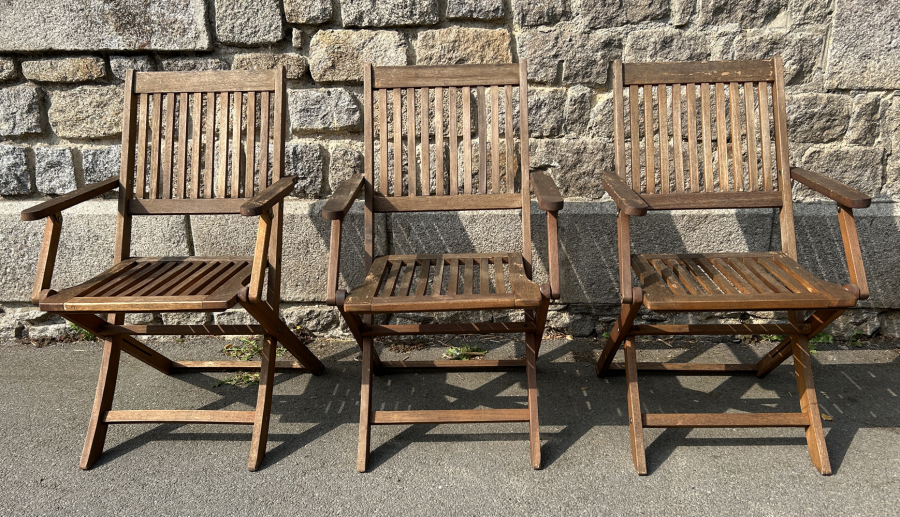 Lot de trois chaises en bois pliante de la marque Deuba, fabriquées en Allemagne. Elles ont un haut dossier, une assise large et confortable et des accoudoirs.