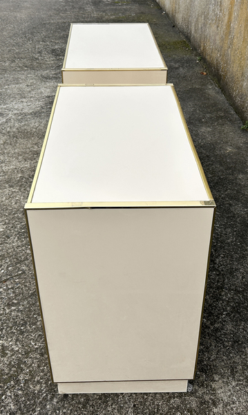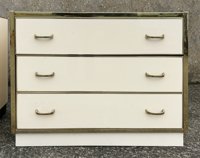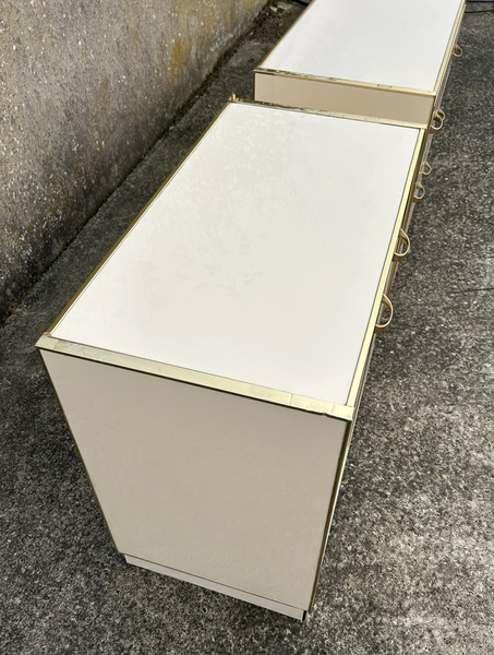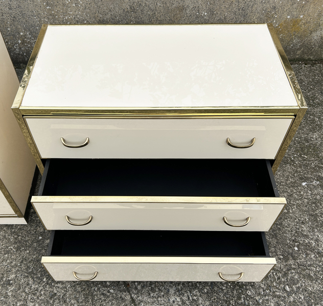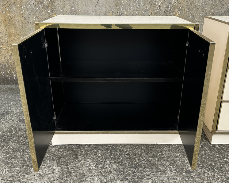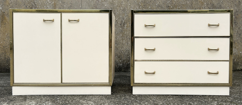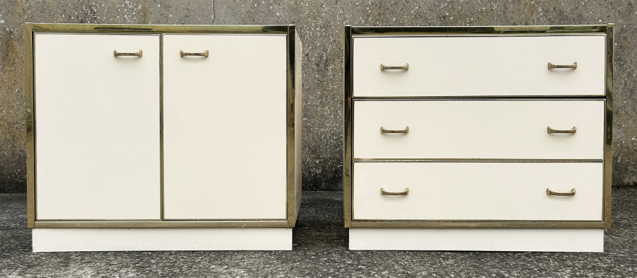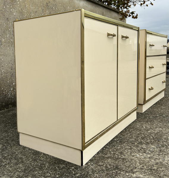 Bel ensemble de meubles vintage des années 70, composé d’un cabinet à portes et d’une commode à trois tiroirs. Leur design élégant, inspiré du style de J.C. Mahey et Pierre Vandel, met en valeur une superbe finition ivoire laqué soulignée par un encadrement en laiton doré au rendu miroir.