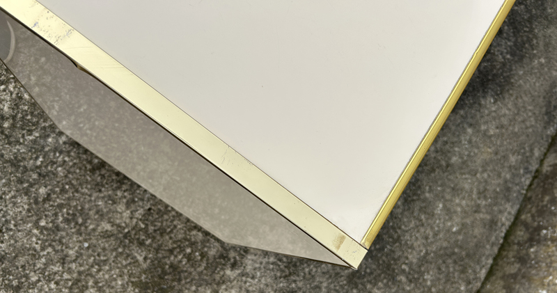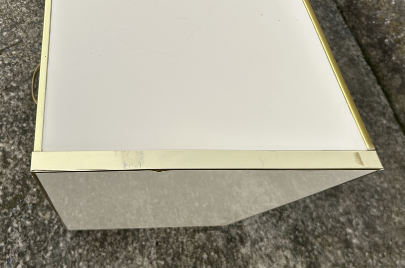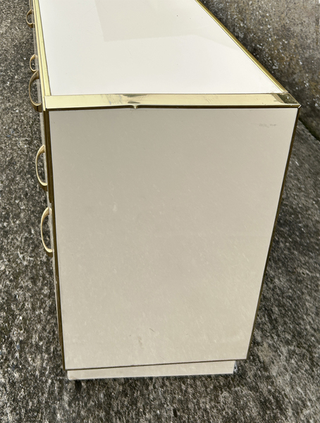Quelques petites traces d'usage au niveau des miroirs dorés sur le dessus du meuble, rien de remarquable. Tout le reste est en très bon état, intérieur comme extérieur.