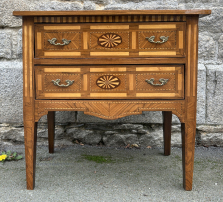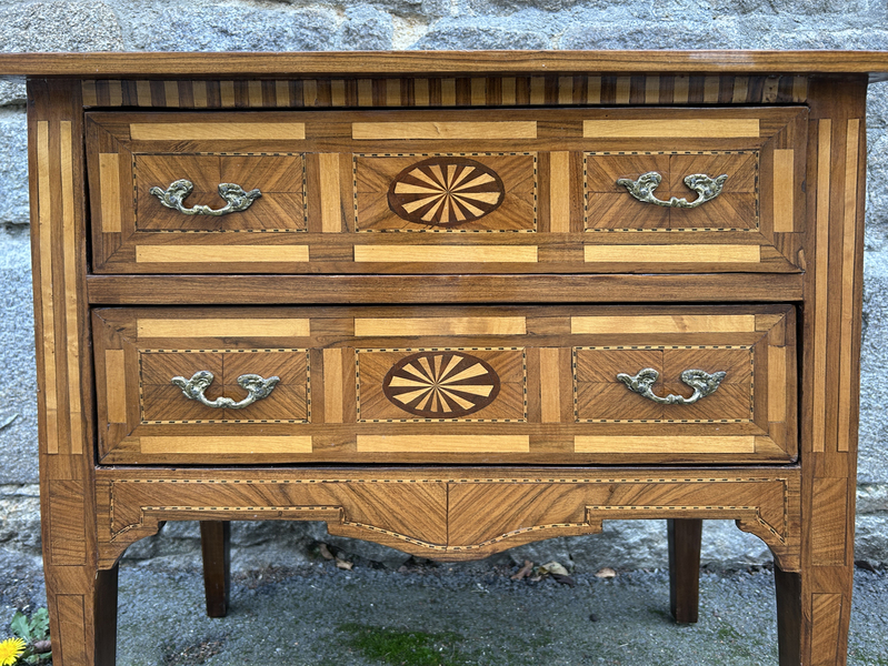 Rare petite commode Empire tardif datant de la fin du XIXᵉ siècle , remarquable par la finesse de sa marqueterie géométrique et l’harmonie de ses proportions. La façade, soigneusement composée, est animée de rosaces marquetées et de filets délicats, révélant un travail d’ébénisterie précis et décoratif. Les poignées en bronze d’origine, finement ciselées, soulignent l’élégance discrète de l’ensemble.