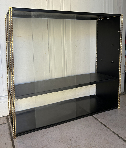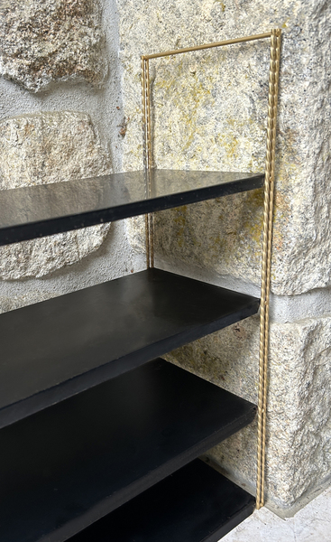 Deux étagères en métal laqué noir et montants de métal doré torsadés.