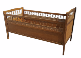 Adorable et charmant lit de bébé en rotin et bois. Sa structure est en bois et contreplaqué. Les parties hautes des quatre côtés est agrémenté de rotin. Ce petit lit est stable et robuste et ne présente que quelques traces d'usage classiques.